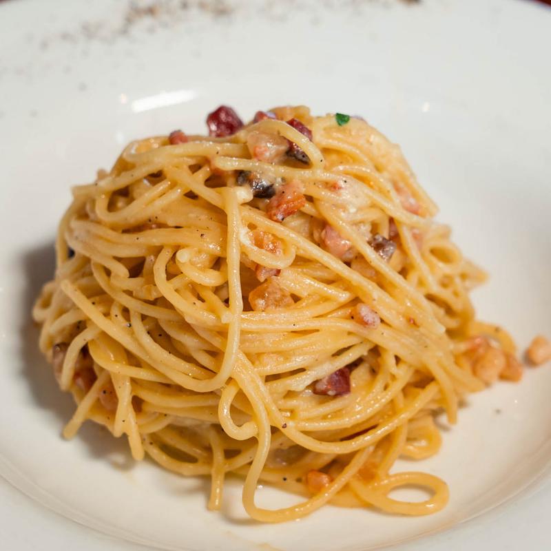 Spaghetti with eggs, pancetta, and Pecorino Romano