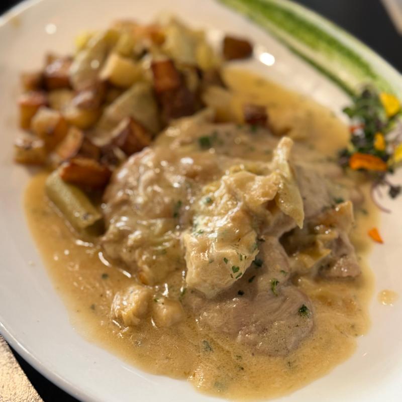 Veal Scallopini finished with Artichokes and Taleggio cheese, in a lemon sauce. Served with Roasted Potatoes.
